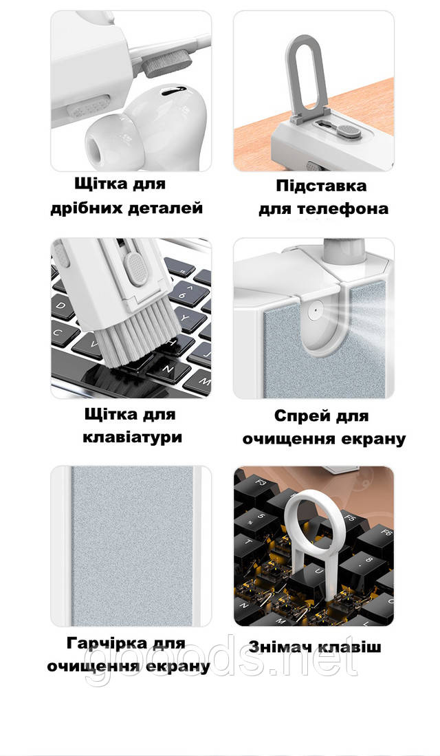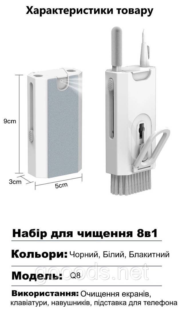 Набір 8в1 можна використовувати для очищення різних пристроїв, таких як навушники, мобільні телефони, планшети, ноутбуки, телевізори та інші цифрові пристрої.